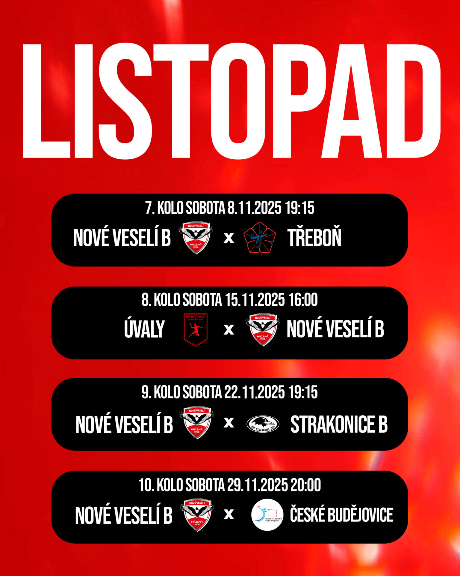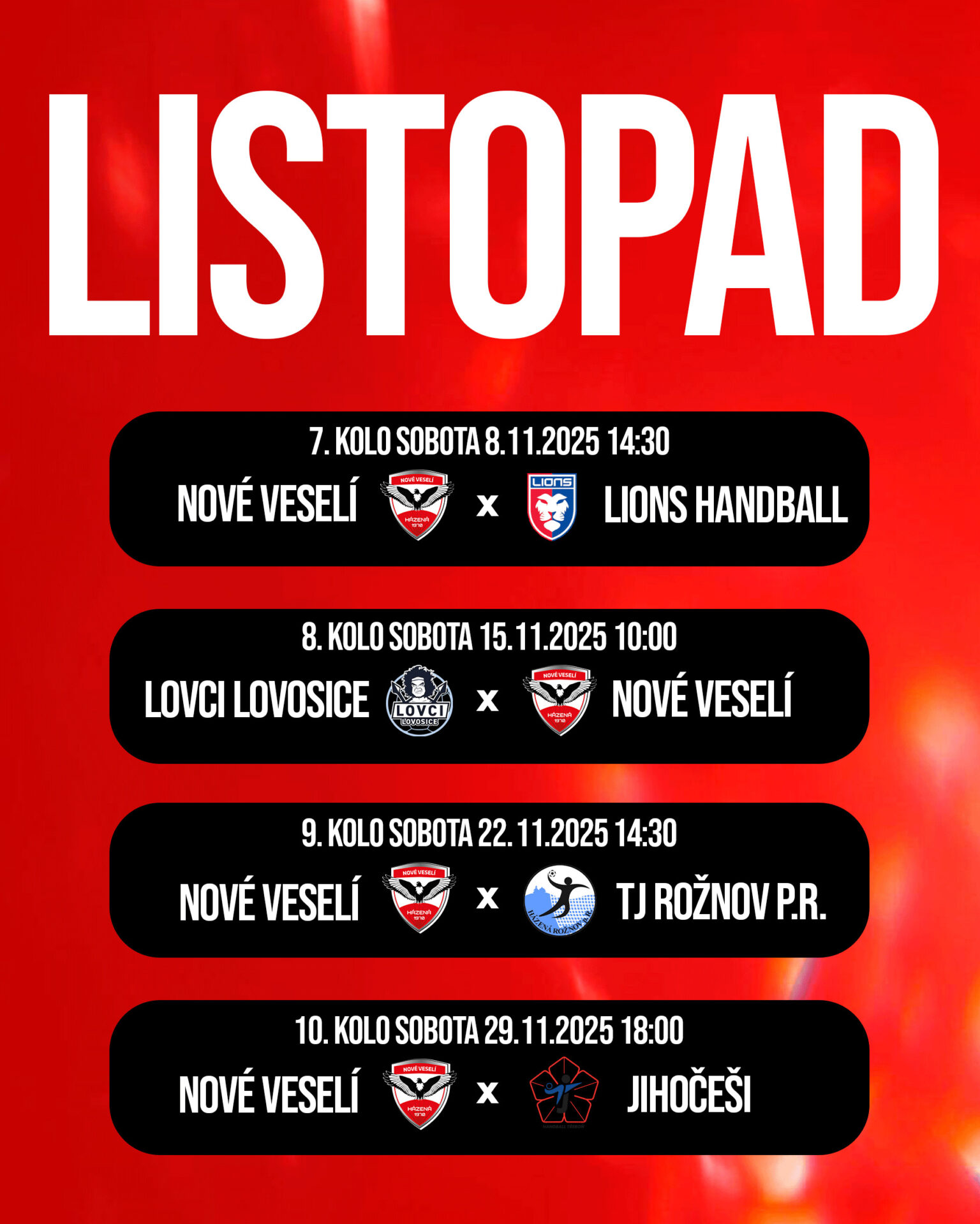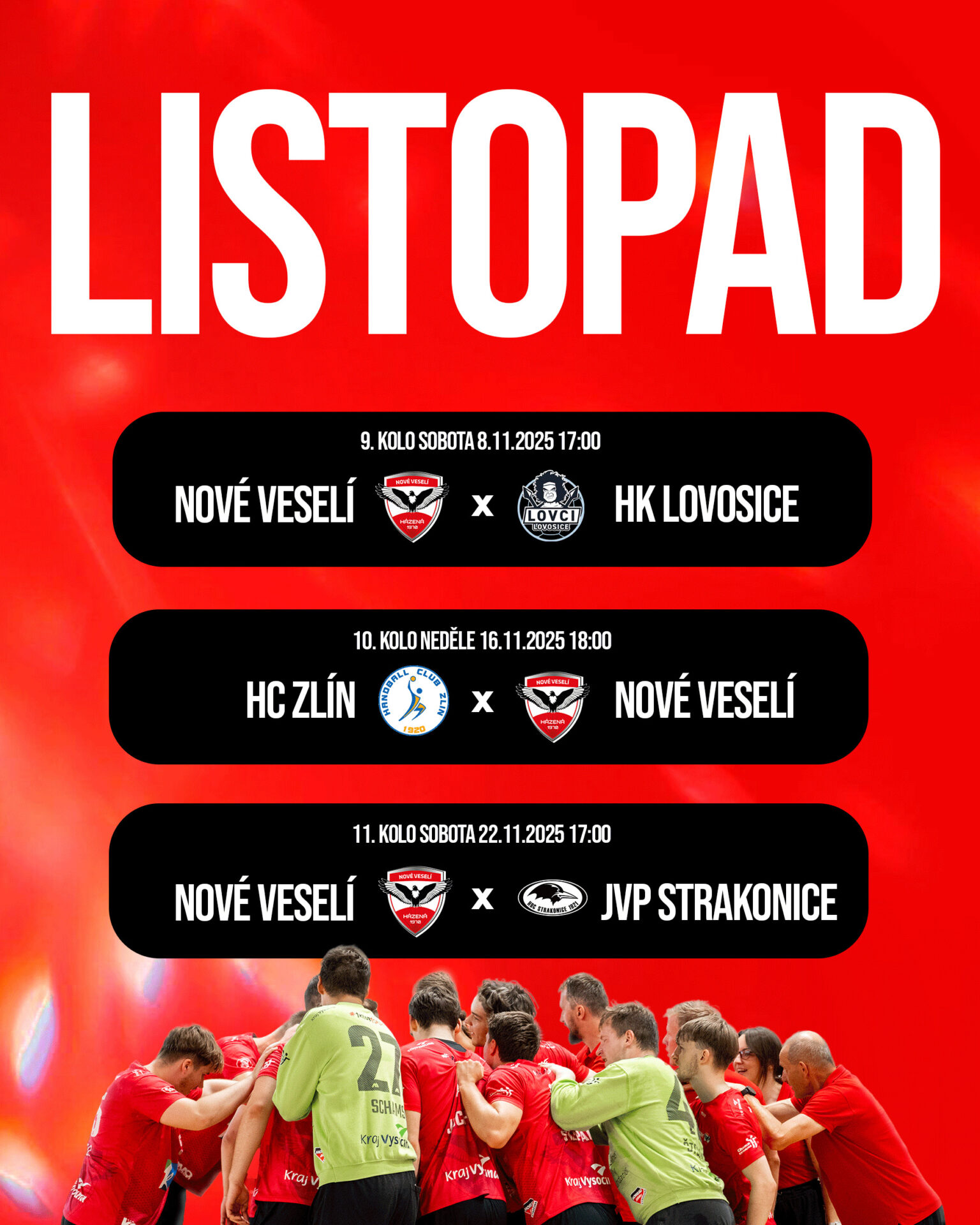 V listopadu čeká naše týmy pořádná porce zápasů! Hned čtyři zápasy, z toho dvakrát na domácí půdě odehrají jak naše dorostenecké, tak mužské týmy. V sobotu 8. listopadu a v sobotu 22. listopadu náš čekají poslední dvě nabité soboty v rámci domácího programu. Muži A pak zahájí listopadový program ve středu 5. listopadu na půdě Vsetína v rámci osmifinálové fáze Českého poháru. Ještě v listopadu pak rozehraje naše extraligové áčko jarní část sezony a netradičně